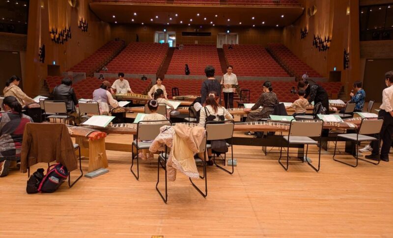 この箏ワークショップ「箏ライブ体験」は、箏を初めて弾く人にもお爪をはめる、座り方を説明する所からスタートして、たった30分程度の手ほどきでプロの演奏家と合奏して箏のライブ感を味わっていただくスタイルです。